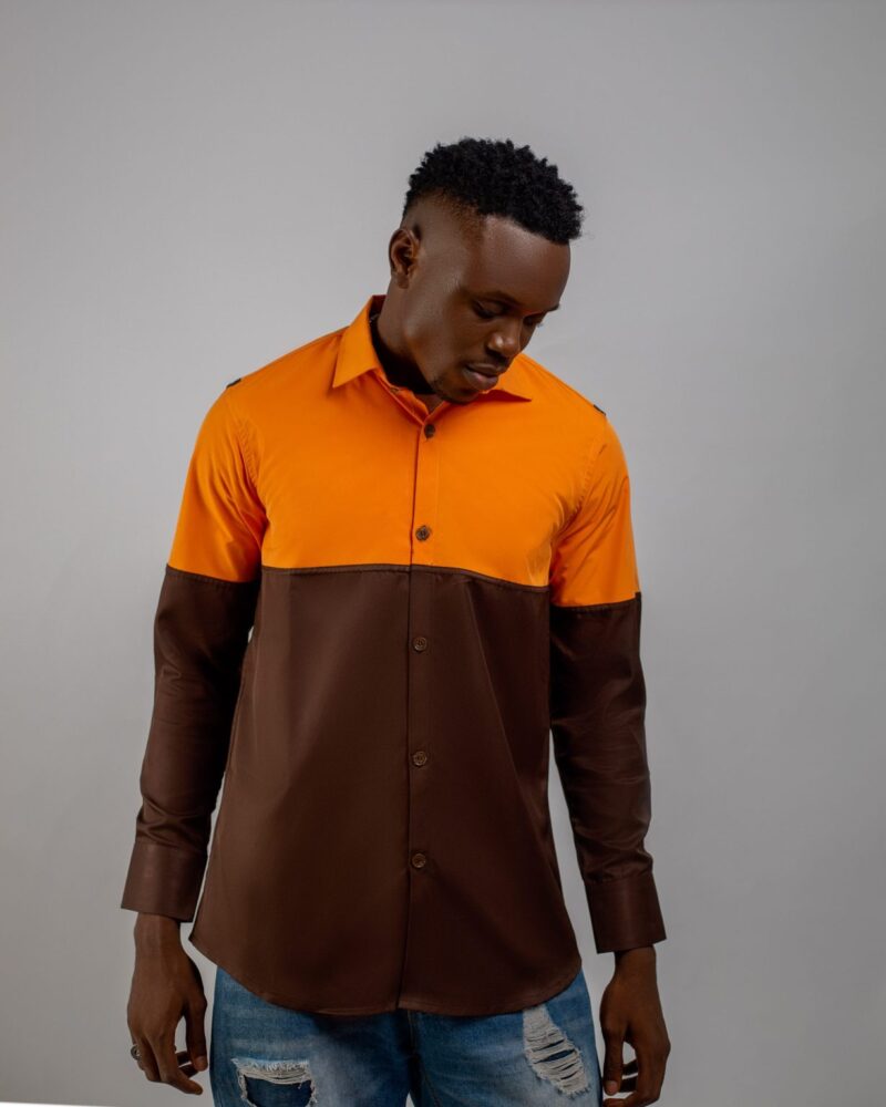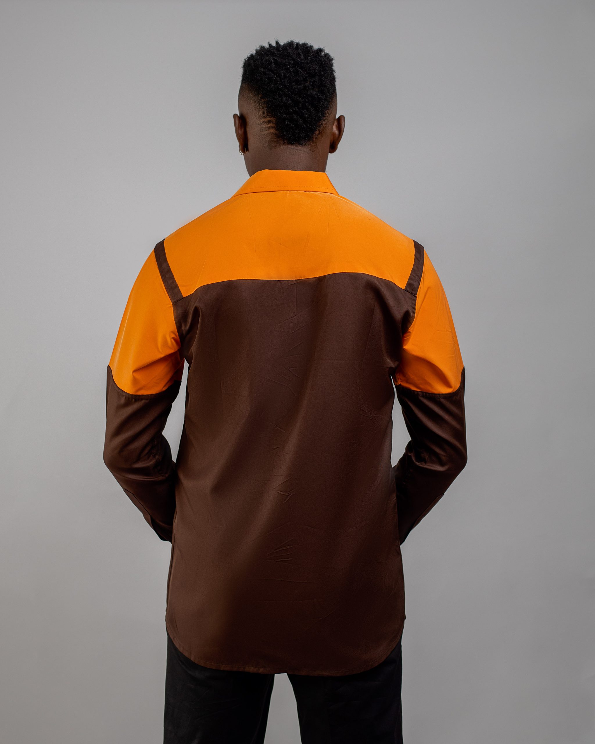Bring energy to your wardrobe with this cotton color block shirt. Featuring bold orange and brown panels, it strikes the perfect balance between playful and modern. A versatile piece that adds personality to both casual and semi-formal looks.